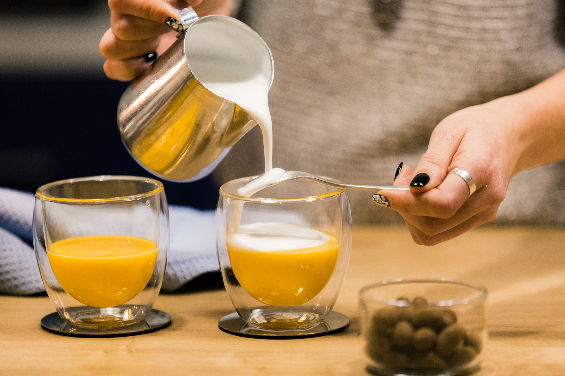 2. Készítsd el a tejhabot, majd egy megfordított teáskanál segítségével óvatosan csurgatsd rá a tojáslikőrre. Majd várj egy kicsit, hogy a tej és tejhab szétváljon. Közben készítsd el az espressot.