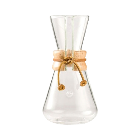 A Chemex kávékészítőt 1941-ben találta fel Peter Schlumbohm. Formatervezése a tehetséges vegyész tudományos tapasztalatain alapul. Az egy darabból készült, jellegzetes homokóra alakú edény kiváló minőségű, hőálló üvegből készül. A kényelmes fogást fa gallér biztosítja bőrszíjjal. Az üveg nem szívja magába a szagokat, így nem befolyásolja a lefőzött kávé ízét.
