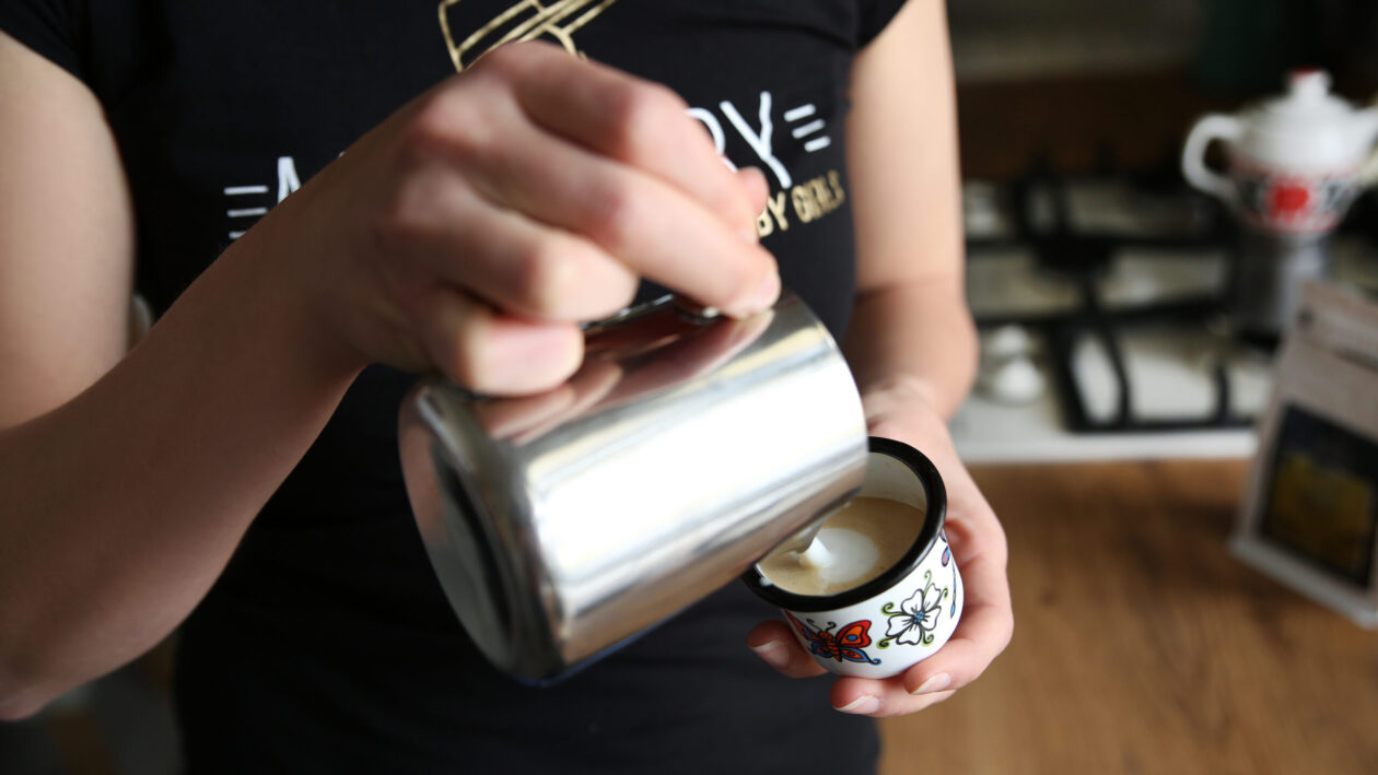 Oszd ketté a kapott kávét, majd öntsd fel fényes és buborékmentes tejhabbal, melyet például egy French Press segítségével tudsz otthon elkészíteni.